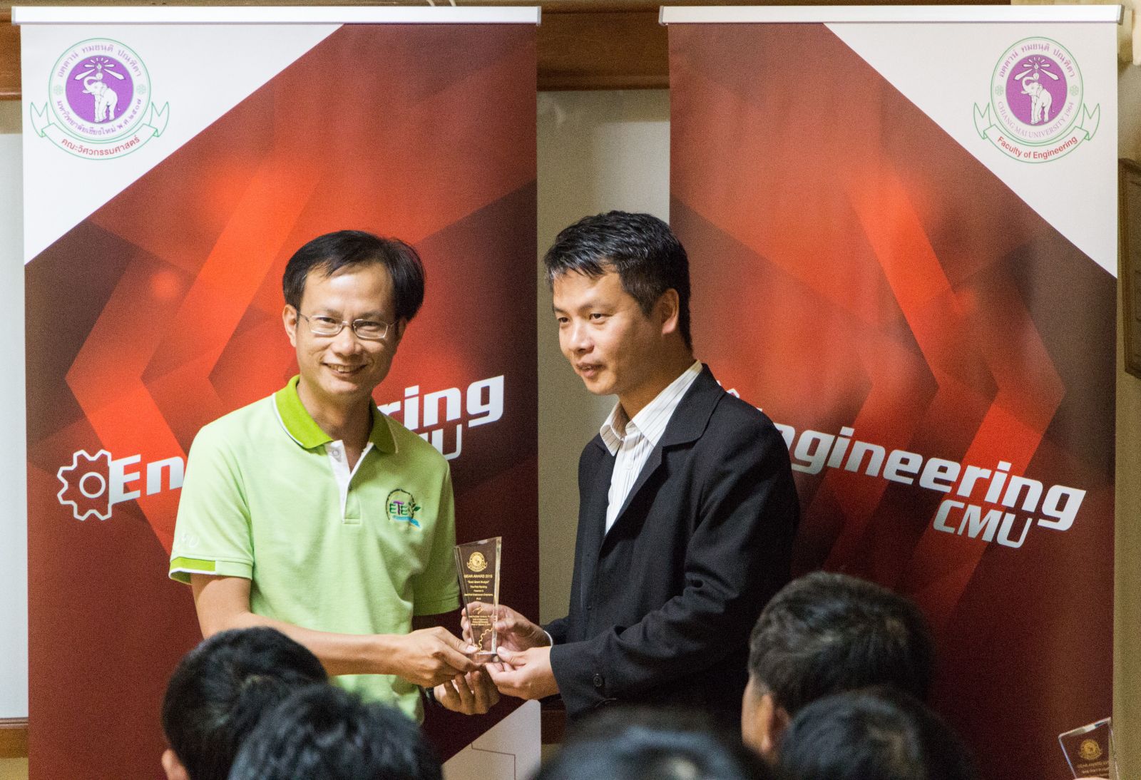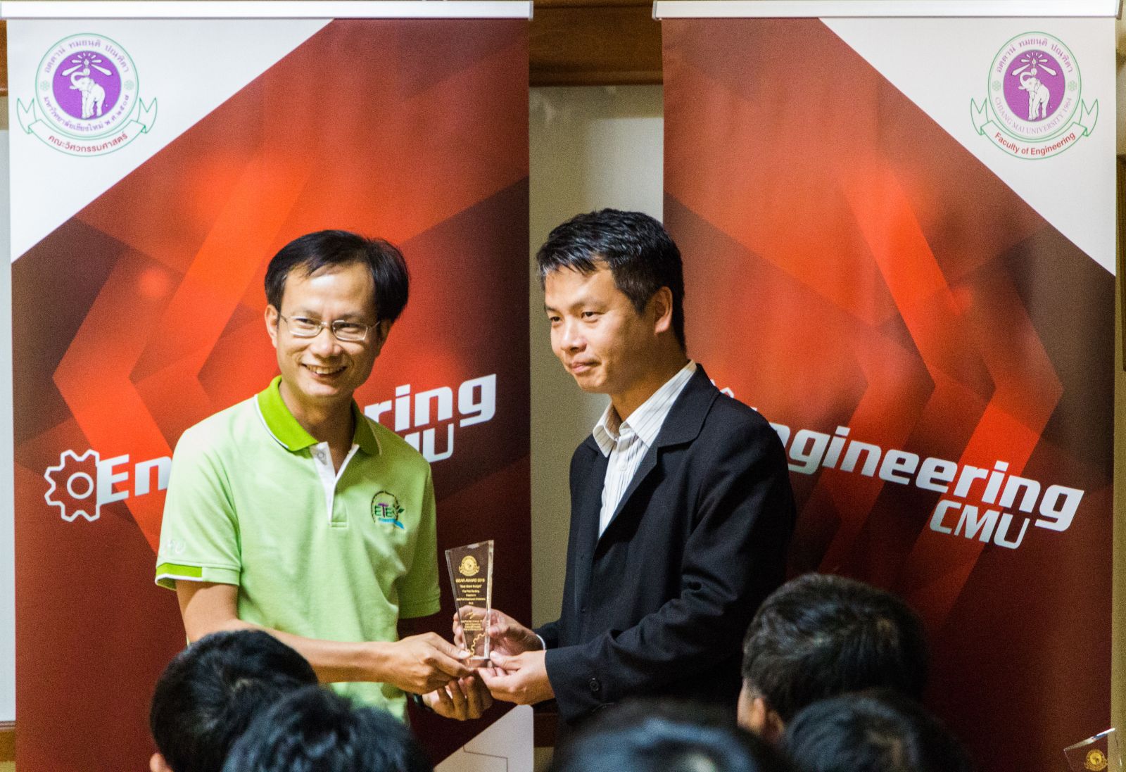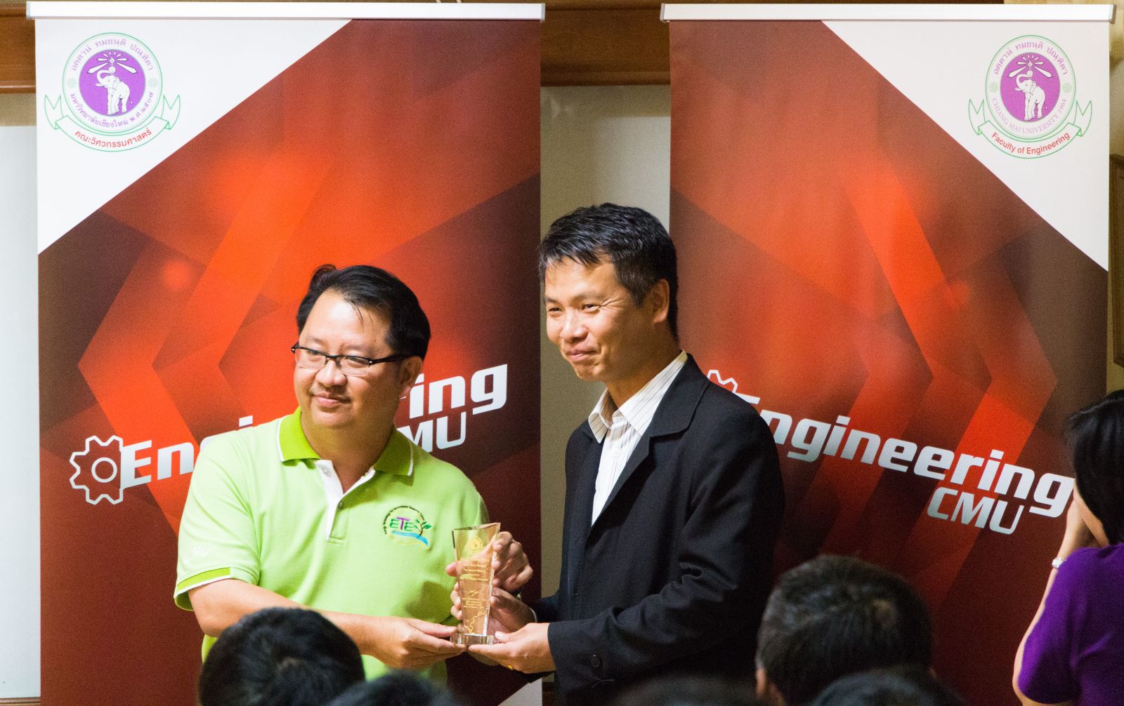 วันนี้ (3 ก.พ. 58) ผศ.ดร.ชัชวาลย์ ชัยชนะ และ ผศ.วงกต วงศ์อภัย หัวหน้าและรองหัวหน้าศูนย์วิจัยเทคโนโลยีพลังงานเพื่อสิ่งแวดล้อม (ETE) เข้าพิธีรับมอบโล่นักวิจัยดีเด่นประจำปี 2558 จาก รศ.ดร.ธงชัย ฟองสมุทร รองคณบดีฝ่ายนโยบาย วิจัยและบริการวิชาการ ณ ห้องประชุม 1 ชั้น 2 ภาควิชาวิศวกรรมอุตสาหการ คณะวิศวกรรมศาสตร์ มหาวิทยาลัยเชียงใหม่